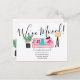 We have moved! A cute and fun quirky illustration of a living room with a pink sofa, pillow, lamp, house plant and a cat, with a teal trow blanket and a knitting kit moving announcement and an elegant and modern script calligraphy typography on editable white background.