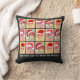 Fun MAKE MUCH ROOM FOR CHRIST Christmas Mushrooms Throw Pillow with CUSTOMIZABLE TEXT which reads 'Make much room for Christ this Christmas'. This text can be personalized with your name or other text. This fun Christian Christmas design shows a grid of mushrooms wearing santa hats with colorful background panels of mushroom, banana and dusky pink.
