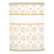It was quick delivery, sooner than expected. This lampshade is exactly as described and the perfect size for my lamp. I replaced the old bell shape lampshade with this barrel shape and it allows me to place my lamp closer to the wall. I love the soft colors of this lamp shade and the modern-southwest design. In the evening, the light is a cream color. I am very happy with this lampshade and highly recommend this product. (Pardon the quality of my photos for this review.)