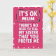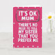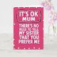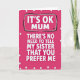 This design shows a fuchsia background covered with evenly spaced tiny white polka dots, creating a cheerful retro look ❤️. In the center, large white sans‑serif letters read “IT’S OK MUM,” set inside an uneven rectangular outline drawn in black with a thin gray line tucked just inside it. A small crown-like doodle sits near the top-right of the framed words, like a teasing nod to being the favorite. Beneath that, the rest of the message runs downward in the same white lettering: “THERE’S NO NEED TO TELL MY SISTER THAT YOU PREFER ME,” giving the layout a stacked, cascading feel. The bright contrast and the cheeky wording suggest a sibling rivalry told with a grin, like a friendly wink between family members 🌼. The white letters have a slight shadow that lifts them off the background without changing the simple flat style. The text stays centered and dominant, with the black-and-gray frame and tiny crown detail drawing the eye to the top line first. The final look is a fuchsia field of white dots with centered white text, a rough black-and-gray border around the top phrase, and a tiny crown mark at the upper right.