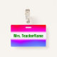 This badge design features a fun, rainbow-like multicolored gradient pattern featuring various shades of colors like yellow, orange, red, pink, purple, blue and green. It also features a customized name in green colored text within a white colored area. A badge like this could perhaps be worn by a teacher, educator, tutor or professor during the early weeks of a school year or a course. It might help the students learn and remember their teacher’s name. [~Z0000175]