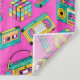 Retro design in the 1980s and 1990s theme, with bright and colorful vintage items such as cassette player, Rubik's cube, sweets, scrunchies, etc. in hot pink, turquoise, and yellow colors.