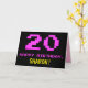 The front of this fun, geeky, and nerdy birthday-themed greeting card design features a large pink number "20", along with the message "HAPPY BIRTHDAY," in pink, and a bold yellow custom recipient name. The text features a look inspired by that of vintage 8-bit style computer/video game graphics from the 1970s and 1980s, and the background is colored black. The inside features a customizable birthday greeting message, or could perhaps be cleared and left blank if a message is to be written by hand instead. A silly customizable birthday card like this might be a fun way to send a message celebrating somebody’s twentieth birthday. [~Z0000478]