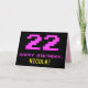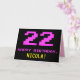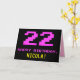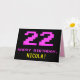 The front of this fun, nerdy, and geeky birthday-themed greeting card design features a large pink number "22", along with the message "HAPPY BIRTHDAY," in pink, and a bold yellow personalized recipient name. The text features a look inspired by that of classic 8-bit style computer game and video game graphics from the 1970s and 1980s, and the background is colored black. The inside features a personalized birthday greeting message, or could perhaps be cleared and left blank if a message is to be written by hand instead. A silly personalized birthday card like this might be a fun way to send a message in celebration of somebody’s twenty second birthday. [~Z0000478]