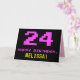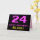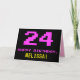 The front of this fun, geeky, and nerdy birthday themed greeting card design features a large pink number "24", along with the message "HAPPY BIRTHDAY," in pink, and a bold yellow custom recipient name. The text has an appearance inspired by that of classic 8-bit style video game and computer game graphics from the 1970s and 1980s, and the background is colored black. The inside has a custom birthday greeting message, or could perhaps be cleared and left blank if a message is to be written by hand instead. A silly customizable birthday card like this might be a fun way of acknowledging somebody’s twenty fourth birthday. [~Z0000478]