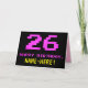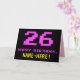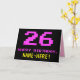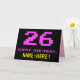 The front of this fun, geeky, and nerdy birthday-themed greeting card design features a large number "26" and the message "HAPPY BIRTHDAY," colored pink, along with a bold yellow personalized recipient name. The text has an appearance inspired by that of classic 8-bit style computer/video game graphics from the 1970s and 1980s, and the background is colored black. The inside has a customized birthday greeting message, or could perhaps be cleared and left blank if a message is to be written by hand instead. A silly personalized birthday card like this might be a fun way to send a message celebrating somebody’s twenty sixth birthday. [~Z0000478]