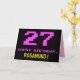 The front of this fun, nerdy, and geeky birthday themed greeting card design features a large number "27" and the message "HAPPY BIRTHDAY," colored pink, along with a bold yellow customizable recipient name. The text features a look inspired by that of vintage 8-bit style video game and computer game graphics from the 1970s and 1980s, and the background is colored black. The inside has a customized birthday greeting message, or could perhaps be cleared and left blank if a message is to be written by hand instead. A silly customizable birthday card like this might be a fun way of celebrating somebody’s twenty seventh birthday. [~Z0000478]