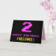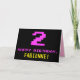 The front of this fun, geeky, and nerdy birthday-themed greeting card design features a large number "2" and the message "HAPPY BIRTHDAY," colored pink, along with a bold yellow personalized recipient name. The text has an appearance inspired by that of vintage 8-bit style video game and computer game graphics from the 1970s and 1980s, and the background is colored black. The inside has a customized birthday greeting message, or could perhaps be cleared and left blank if a message is to be written by hand instead. A silly customizable birthday card like this might be a fun way to send a message in celebration of somebody’s second birthday. [~Z0000478]