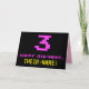 The front of this fun, geeky, and nerdy birthday greeting card design features a large pink number "3", along with the message "HAPPY BIRTHDAY," in pink, and a bold yellow custom recipient name. The text has an appearance inspired by that of vintage 8-bit style video game and computer game graphics from the 1970s and 1980s, and the background is colored black. The inside features a customized birthday greeting message, or could perhaps be cleared and left blank if a message is to be written by hand instead. A silly birthday card like this might be a fun way to send birthday wishes to a girl or somebody else who is celebrating their third birthday. [~Z0000478]