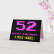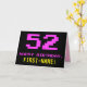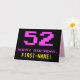 The front of this fun, nerdy, and geeky birthday greeting card design features a large number "52" and the message "HAPPY BIRTHDAY," colored pink, along with a bold yellow personalized recipient name. The text has a look inspired by that of vintage 8-bit style video/computer game graphics from the 1970s and 1980s, and the background is colored black. The inside has a custom birthday greeting message, or could perhaps be cleared and left blank if a message is to be written by hand instead. A silly customizable birthday card like this might be a fun way to acknowledge somebody’s fifty second birthday. [~Z0000478]