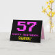 The front of this fun, nerdy, and geeky birthday-themed greeting card design features a large number "57" and the message "HAPPY BIRTHDAY," colored pink, along with a bold yellow custom recipient name. The text features a look inspired by that of vintage 8-bit style computer/video game graphics from the 1970s and 1980s, and the background is colored black. The inside features an editable birthday greeting message, or could perhaps be cleared and left blank if a message is to be written by hand instead. A silly birthday card like this might be a fun way to send birthday wishes to a woman or somebody else who is celebrating their fifty seventh birthday. [~Z0000478]