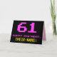 The front of this fun, geeky, and nerdy birthday themed greeting card design features a large pink number "61", along with the message "HAPPY BIRTHDAY," in pink, and a bold yellow personalized recipient name. The text features a look inspired by that of retro 8-bit style video game and computer game graphics from the 1970s and 1980s, and the background is colored black. The inside features a customizable birthday greeting message, or could perhaps be cleared and left blank if a message is to be written by hand instead. A silly personalized birthday card like this might be a fun way of acknowledging somebody’s sixty first birthday. [~Z0000478]