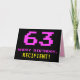 The front of this fun, nerdy, and geeky birthday-themed greeting card design features a large pink number "63", along with the message "HAPPY BIRTHDAY," in pink, and a bold yellow custom recipient name. The text features a look inspired by that of classic 8-bit style computer/video game graphics from the 1970s and 1980s, and the background is colored black. The inside has a customizable birthday greeting message, or could perhaps be cleared and left blank if a message is to be written by hand instead. A silly customizable birthday card like this might be a fun way of celebrating somebody’s sixty third birthday. [~Z0000478]