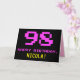 The front of this fun, geeky, and nerdy birthday themed greeting card design features a large number "98" and the message "HAPPY BIRTHDAY," colored pink, along with a bold yellow custom recipient name. The text has a look inspired by that of classic 8-bit style video game and computer game graphics from the 1970s and 1980s, and the background is colored black. The inside has a customized birthday greeting message, or could perhaps be cleared and left blank if a message is to be written by hand instead. A silly personalized birthday card like this might be a fun way of celebrating somebody’s ninety eighth birthday. [~Z0000478]