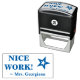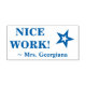 This encouraging rubber stamp design features the message "NICE WORK!" and a customized teacher's name. It also features a decorative star shape. It could be used by a teacher or educator when marking assignments, to acknowledge that the student has done well.