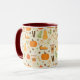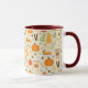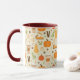 This design showcases a delightful fall-themed pattern filled with cozy autumn elements. The design includes illustrations of pumpkins, slices of pumpkin pie topped with whipped cream, warm fall beverages in to-go cups, and butternut squash. Scattered among these are cinnamon sticks, star anise, sprigs of greenery, autumn leaves, acorns, and small berries, all set against a soft cream background. The pattern exudes a warm and inviting atmosphere, perfect for celebrating the flavors and colors of the autumn season.