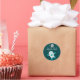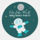 This cute boy's birthday party round sticker has an out of this world space theme! The background has a dark teal color with lots of yellow, white, and grey stars in the background. There is an astronaut on the bottom with a moon at the top. Out of this World Birthday Party is written in the middle.