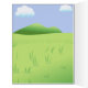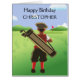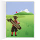 A fun cartoon design featuring a golfer in vintage attire standing in the rough looking towards the green and flag. The golfer is carrying a golf bag with golf clubs. Any name or initials can be entered to create a unique personalized golf greetings card for the keen golfer or golf fan
