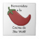 SPANISH LANGUAGE VERSION! (En español, espanol, o lengua española.) Cute and colorful personalized kitchen housewares decor. Welcome to my name kitchen. Personalize with YOUR FIRST NAME where it says "She Wolf"! You can change tile background color, too. Graphics design with an Arizona or New Mexico flavor. One red chili pepper. Fun for the Spanish-speaking hot chile or salsa lover! Domestic goddess and BBQ king favorite! Cool gift for your Spanish teacher. With a little help from my friends at www.scrappindoodles.com. From She Wolf Medicine.