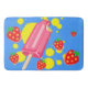 A bathmat with a summery theme. Designed with pink popsicle and some red strawberries tumbling around the popsicle along with some yellow paint splashes. Blue background.