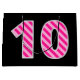 One side of this fun and simple birthday-themed giftbag design features a large number "10" with a dark pink and light pink stripes pattern. The birthday greeting message "Happy 10th Birthday," and an editable name appear on the other side, both in yellow colored text. The background has a black coloring. A gift bag like this might be used when wrapping presents or gifts being given to celebrate somebody’s tenth birthday. [~Z0000378]