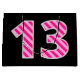 One side of this simple and fun birthday-themed gift bag design has a large number "13" featuring a dark pink and light pink stripes pattern. The other side features the birthday greeting message "Happy 13th Birthday," and a personalized name, both in yellow colored text. The background has a black coloring. Gift bags like this might be used when wrapping gifts or presents being given in honor of somebody’s thirteenth birthday. [~Z0000378]
