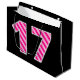 One side of this simple and fun birthday-themed giftbag design has a large number "17" featuring a dark pink and light pink stripes pattern. The other side has the birthday greeting message "Happy 17th Birthday," and a customizable name, both in yellow colored text. The background has a black coloring. A gift bag like this might be used when wrapping gifts or presents being given to celebrate somebody’s seventeenth birthday. [~Z0000378]