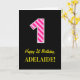The front of this simple and fun birthday-themed greeting card design features a large number "1", with a light pink and dark pink stripes pattern. It also features the message "Happy 1st Birthday,", and a customizable name. The background of the front is colored black. The inside features a personalized birthday greeting message, or could perhaps be cleared and left blank if a message is to be written by hand instead. A personalized birthday card like this might be a fun way to acknowledge somebody’s first birthday. [~Z0000377]