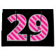 One side of this fun and simple birthday-themed giftbag design features a large number "29" with a dark pink and light pink stripes pattern. The other side has the birthday greeting message "Happy 29th Birthday," and a custom name, both in yellow colored text. The background has a black coloring. A gift bag like this might be used when wrapping gifts or presents being given to celebrate somebody’s twenty ninth birthday. [~Z0000378]