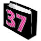 One side of this fun and simple birthday-themed giftbag design features a large number "37" with a dark pink and light pink stripes pattern. The birthday greeting message "Happy 37th Birthday," and a custom name appear on the other side, both in yellow colored text. The background is colored black. A gift bag like this might be used when wrapping presents or gifts being given in honor of somebody’s thirty seventh birthday. [~Z0000378]