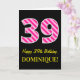 Fun Pink Striped "39"; Happy 39th Birthday; Name Card