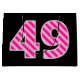 One side of this fun and simple birthday-themed giftbag design has a large number "49" featuring a dark pink and light pink stripes pattern. The other side features the birthday greeting message "Happy 49th Birthday," and an editable name, both in yellow colored text. The background has a black coloring. Gift bags like this might be used when wrapping gifts or presents being given to celebrate somebody’s forty ninth birthday. [~Z0000378]
