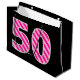 One side of this simple and fun birthday-themed gift bag design features a large number "50" with a dark pink and light pink stripes pattern. The other side features the birthday greeting message "Happy 50th Birthday," and a custom name, both in yellow colored text. The background is colored black. Gift bags like this might be used when wrapping gifts or presents being given to celebrate somebody’s fiftieth birthday. [~Z0000378]