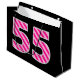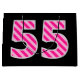 One side of this simple and fun birthday-themed giftbag design features a large number "55" with a dark pink and light pink stripes pattern. The birthday greeting message "Happy 55th Birthday," and a custom name appear on the other side, both in yellow colored text. The background is colored black. Gift bags like this might be used when wrapping gifts or presents being given to somebody who is celebrating their fifty fifth birthday. [~Z0000378]