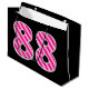 One side of this fun and simple birthday-themed giftbag design features a large number "88" with a dark pink and light pink stripes pattern. The birthday greeting message "Happy 88th Birthday," and a custom name appear on the other side, both in yellow colored text. The background has a black coloring. Gift bags like this might be used when wrapping presents or gifts being given in honor of somebody’s eighty eighth birthday. [~Z0000378]