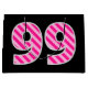 One side of this fun and simple birthday-themed gift bag design features a large number "99" with a dark pink and light pink stripes pattern. The other side features the birthday greeting message "Happy 99th Birthday," and a customizable name, both in yellow colored text. The background has a black coloring. Gift bags like this might be used when wrapping gifts or presents being given to somebody who is celebrating their ninety ninth birthday. [~Z0000378]