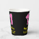This joyful birthday-themed square sticker design features a large number “11” with a light pink and dark pink stripes pattern, along with the message “Happy 11th Birthday,”, and an editable name. The background is colored black. Paper cups like this might be used at a birthday party held in celebration of somebody’s 11th birthday. [~Z0000580]