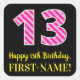 Fun Pink Stripes “13”: Happy 13th Birthday + Name Square Sticker