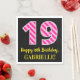 This fun birthday-themed paper napkin design features a large number "19" with a light pink and dark pink stripes pattern, along with the message "Happy 19th Birthday,", and a custom name. The background is colored black. Fun, customizable paper napkins like this might be used at a birthday celebration being held in honor of somebody’s nineteenth birthday. [~Z0000380]