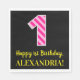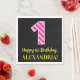 This fun birthday-themed paper napkin design features a large number "1" with a dark pink and light pink stripes pattern, along with the message "Happy 1st Birthday,", and a customizable name. The background is colored black. Birthday themed paper napkins like this might be fun to use at a celebration being held to honor somebody who is celebrating their first birthday. [~Z0000380]