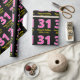 This fun birthday-themed wrapping paper design features a large number "31" with a light pink and dark pink stripes pattern, along with the message "Happy 31st Birthday,", and a custom name. The background is colored black. Birthday themed wrapping paper like this might be a fun way to wrap a gift or present being given to somebody who is celebrating their thirty first birthday. [~Z0000376]