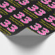 This fun birthday-themed wrapping paper design features a large number "33" with a dark pink and light pink stripes pattern, along with the message "Happy 33rd Birthday,", and a custom name. The background is colored black. Birthday themed wrapping paper like this might be used when giving a gift or present in celebration of somebody’s 33rd birthday. [~Z0000376]