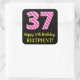 This joyful birthday-themed square sticker design features a large number “37” with a dark pink and light pink stripes pattern, along with the message “Happy 37th Birthday,”, and a customizable name. The background is colored black. Fun, cheerful, personalized stickers like this might be given as a birthday present, or used while wrapping gifts, or perhaps used as a birthday party decoration when celebrating somebody’s 37th birthday. [~Z0000578]