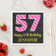 This fun birthday-themed paper napkin design features a large number "57", with a dark pink and light pink stripes pattern. It also features the message "Happy 57th Birthday,", and a personalized name. The background is colored black. Fun, customizable paper napkins like this might be used at a birthday party being held to celebrate somebody’s fifty seventh birthday. [~Z0000380]