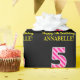 This fun birthday-themed wrapping paper design features a large number "5" with a light pink and dark pink stripes pattern, along with the message "Happy 5th Birthday,", and an editable name. The background is colored black. Wrapping paper like this might be a fun way of wrapping a birthday present or gift being given to somebody who is celebrating their fifth birthday. [~Z0000376]