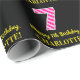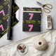 This fun birthday-themed wrapping paper design features a large number "7", with a dark pink and light pink stripes pattern. It also features the message "Happy 7th Birthday,", and a personalized name. The background is colored black. Fun wrapping paper like this might be used when wrapping presents being given to somebody in celebration of their 7th birthday. [~Z0000376]