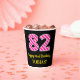 This joyful birthday-themed square sticker design features a large number “82” with a light pink and dark pink stripes pattern, along with the message “Happy 82nd Birthday,”, and a custom name. The background is colored black. Cheerful birthday themed paper cups like this might be used at a party in celebration of somebody’s eighty second birthday. [~Z0000580]
