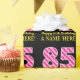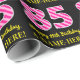 This fun birthday-themed wrapping paper design features a large number "85", with a light pink and dark pink stripes pattern. It also features the message "Happy 85th Birthday,", and a customizable name. The background is colored black. Wrapping paper like this might be used when wrapping gifts being given to somebody in celebration of their 85th birthday. [~Z0000376]
