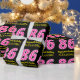 This fun birthday-themed wrapping paper design features a large number "86", with a light pink and dark pink stripes pattern. It also features the message "Happy 86th Birthday,", and a custom name. The background is colored black. Wrapping paper like this might be a fun way of wrapping a birthday present or gift being given to somebody who is celebrating their 86th birthday. [~Z0000376]