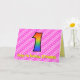This happy and upbeat 1st birthday greeting card design has a front featuring a large number "1" having a colorful rainbow spectrum inspired gradient pattern, on a cheerful dark pink and light pink heart shapes stripes pattern background. The front also features the message "Happy 1st Birthday,", and a customizable recipient name. The inside features a custom birthday greeting message, or could perhaps be cleared and left blank if a message is to be written by hand instead. A birthday card like this might be a fun and happy way of sending birthday wishes to somebody who is celebrating their first birthday. [~Z0000418]